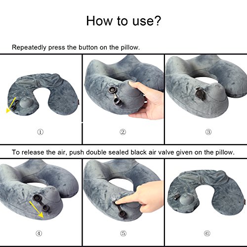 - 【Inflates with a Valve】- This unique neck pillow inflates with a button - Blow up in less than 60 seconds! Press repeatedly on the lower profile of the pillow till you reach your expected inflation! To release the air, push double sealed black air valve given on the pillow.