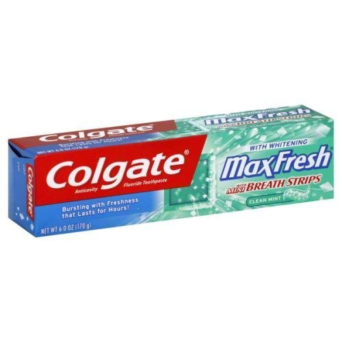 -. Title : Colgate MaxFresh + Whitening Fluoride Toothpaste with Mini Breath Strips, Clean Mint, 6 Oz each Pack of 4