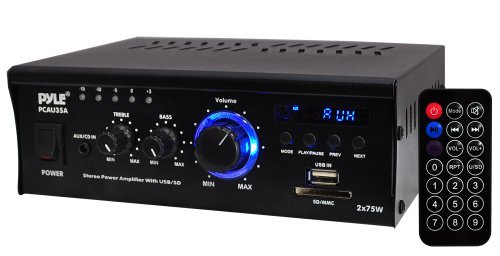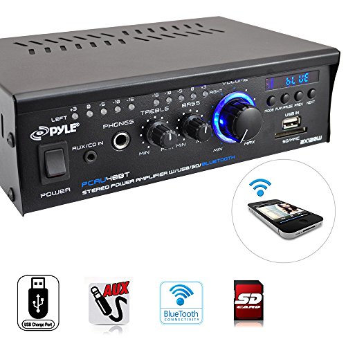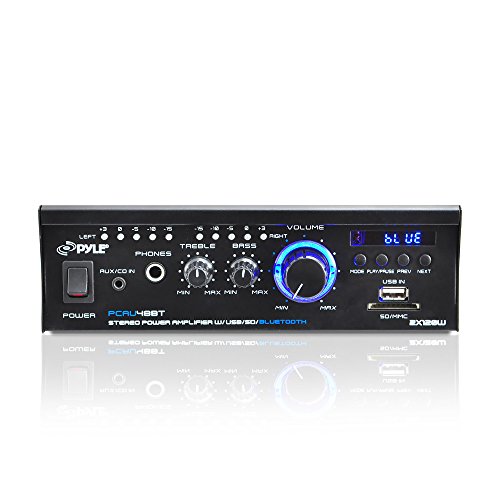 The Pyle Mini Blue Series (PCAU48BT) mini stereo power amplifier provides up to 120 watts x 2 at 4 Ohms. Built-in Bluetooth technology allows you to instantly stream wireless audio from your favorite devices -- quickly and easily. This compact power amplifier also features USB flash and SD memory card readers with digital LCD display. Connect external devices using the RCA (L/R) or AUX (3.5mm) stereo input connector jacks, let the music play. It's compatible with virtually any audio or computerized device (works with iPhones, Androids, Smartphones, iPods, MP3 Players, iPads, Tablets, etc.). Additional features include USB charging port, built-in short circuit and power surge protection, headphone jack, rotary master volume control, push-type speaker terminals and more. Enjoy compact and powerful wireless amplifier music streaming ability with the Pyle Mini Blue Series Bluetooth Amp. For any further queries please contact Pyle Customer Support Number Customer service contact number at @718-535-1800 Ext: 279 or emailed at support@pyleaudio.comFeature