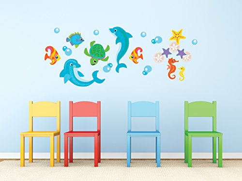 Does your room need a little underwater magic? Look no further! This beautiful dolphin fabric wall decal set comes with fish, sea turtle, sea horses, star fish, and more. Unlike traditional vinyl, our decals are made from a non-toxic fabric material that is extremely easy to apply. Transform your room in minutes with our repositionable decals.