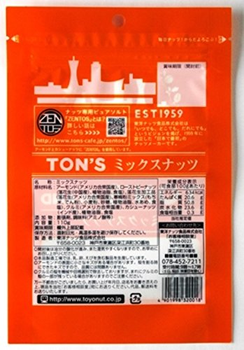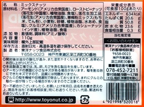 原材料:アーモンド(アメリカ合衆国産)、ローストピーナッツ(落花生(中国産)、植物油脂、食塩)、落花生加工品(落花生(アメリカ合衆国産)、寒梅粉ミックス(もち米、でん粉)、小麦粉、砂糖、植物油脂、水あめ、食塩)、クルミ(アメリカ合衆国産)、カシューナッツ(インド産)、植物油脂、食塩 添加物:膨張剤、調味料(アミノ酸等)