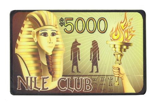 This is the $5000 Nile Club Casino Quality Ceramic Poker Plaque. The Nile Club is presented as a fictional Egyptian casino and each chip within the set displays its own unique historical inlay design. The Nile Club is a classy look for any poker chip enthusiast and offers players a true casino quality look and feel.