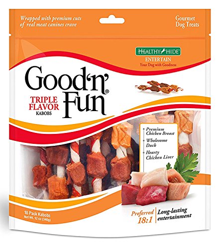 -. Binding : Misc. -. Brand : Dog Treats -. Color : Multi-Color -. EAN : 0715658264796 -. Feature : Preferred 18:1 over other combination chews / Long-lasting entertainment. Long-lasting treat with 5 flavors that dogs crave / Made with real chicken, duck and liver jerky. Good 'n' Fun Kabobs are high in protein / Good 'n' Fun dog treats are manufactured under strict food safety guidelines / Healthy and delicious way to satisfy your dog's natural urge to chew -. Label : Kardin -. Manufacturer : Kardin -. Model : KARDIN-H-82245H-12 -. MPN : KARDIN-H-82245H-12 -. PackageQuantity : 1 -. PartNumber : KARDIN-H-82245H-12 -. ProductGroup : Pet Products -. ProductTypeName : PET_SUPPLIES -. Publisher : Kardin -. Size : 12 oz. -. Studio : Kardin -. Title : Healthy Hide Good 'n' Fun Triple Flavor Kabobs Gourmet Dog Treats, 12 oz -. UPC : 715658264796