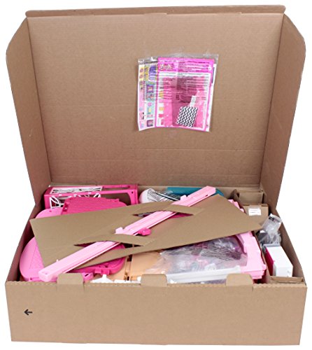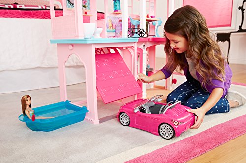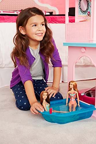Move right into the Barbie Dream house and discover a world of possibilities because with Barbie , anything is possible! Three floors, seven rooms and a working elevator provide the perfect setting for all kinds of stories, from a fun night in to getting ready for girls' night out. The built-in garage has a door that realistically opens and closes by sliding a tab. Attached to the garage is a beautiful atrium window -- flip the window down, and it converts into a swimming pool, perfect for a fun pool party for Barbie doll and her friends! A smart furniture piece -- designed to look like a living room cabinet or kitchen island on one side and a bathroom vanity on the other -- magically recognizes "smart" accessories that activate different lights, sounds and motions to bring stories to life. Get cooking in the kitchen with its sleek appliances and realistic cookware and groceries. On the second floor, dine in style in the dining room at the modern table set for two; in the bathroom, prepare for a big night out at the sink/vanity and luxe tub. The third floor offers another view into imagination with a beautiful bedroom, complete with a dramatic pink canopied bed; a walk-in closet where Barbie doll can check out her amazing outfits in the mirror and hang up her fashions (sold separately); and a gorgeous living room with a special twist of its own -- slide your own smartphone (not included) into the "flat screen" television and let Barbie get cozy on the couch with a movie or video that helps add to play. Have fun sending Barbie doll up and down the working elevator -- easily activated with a child-friendly sliding tab -- as one fabulous story is played out after another! Plus, this version comes in simple brown packaging to secure the secret and enhance the surprise. Dolls, pets and car sold separately. Dolls cannot stand alone. Smartphone not included. Colors and decorations may vary.Feature