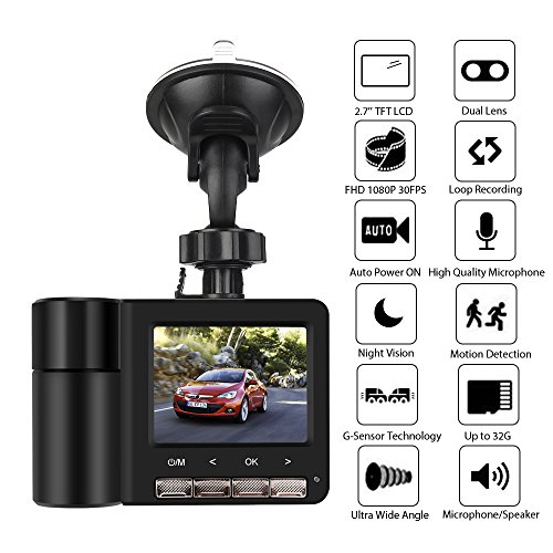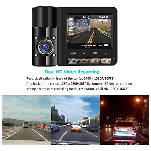 DUAL LENS DASH CAM: The front camera 1440 x 1080P/30fps (Full HD), rear camera 1280 x 720P/30fps (support 180 degree rotate). 6 glasses layers. 170 degree ultra wide angle dual lens. Record the driving wonderful moment in car and all the events in front or back of the car