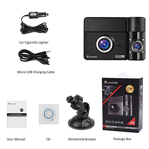WHAT YOU GET: 1 x Lightweight and Small Dual Lens Dash Cam, 1 x Car Power Cable (DC plug to Micro USB), 1 x USB A to Micro USB Cable, 1 x CD, 1 x Windshield Mount, 1 x Users Manual. We offer 1 year warranty and superb customer service. Please do not hesitate to contact us if you have any questions