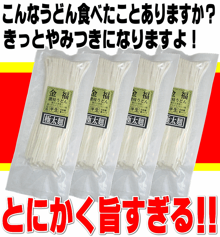 ■原材料名------------------小麦粉(ASW、讃岐の夢2000)、食塩、加工澱粉、酒精 ■内容量 ------------------完熟讃岐うどん(半生麺)・極太 1袋(250g)×4個(8人前) ■賞味期限 常温------------------完熟讃岐うどん・極太麺 約45日■お届けの目安------------------当店出荷後、日祭日を除く7日以内■保存方法 ------------------直射日光を避け常温で保存し、夏季は冷蔵庫に保存■販売者------------------■小松屋KK 香川県仲多度郡琴平町953-1■その他注意事項のし、包装、メッセージカード、日時指定全て不可。贈答に向きません。宅配便で送る場合、送料追加されます。