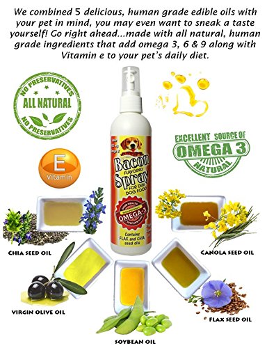 -. Binding : Misc. -. EAN : 0678909535413 -. Feature : Adds 150 mg of Omega 3 daily with 2 servings a day. One bottle will last 3-4 months with two servings per day. / 100% All Natural Ingredients, no artificial colorants, thickeners or preservatives / Precise control of the application of the dog food dressing to the dog food. Great for the picky eater! / Will not turn dry dog food mushy, contains no water! No Refrigeration required after opening. One year shelf life. / Safe for use on diabetic dog food. Does not contain protein, sodium or potassium. -. Label : Green Seal Products -. Manufacturer : Green Seal Products -. MPN : Bacon Spray 8 oz -. PackageQuantity : 1 -. PartNumber : Bacon Spray 8 oz -. ProductGroup : Pet Products -. ProductTypeName : PET_SUPPLIES -. Publisher : Green Seal Products -. Studio : Green Seal Products -. Title : Bacon Spray for Dry Dog Food -. UPC : 678909535413