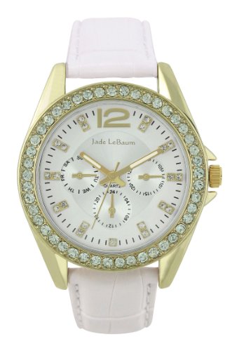 -. Title : Womens White Leather Strap Watch Gold-Tone Rhinestones Accented Bezel Jade LeBaum - JB202738G