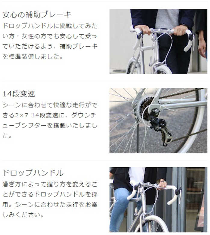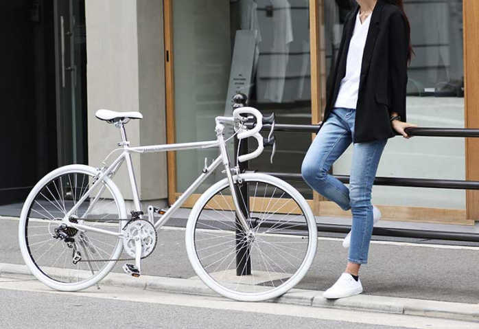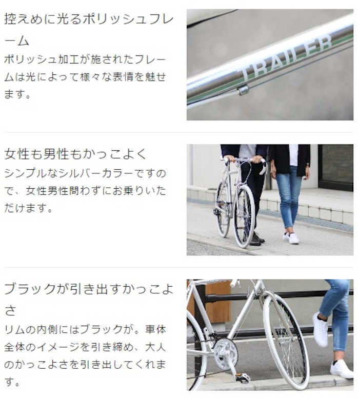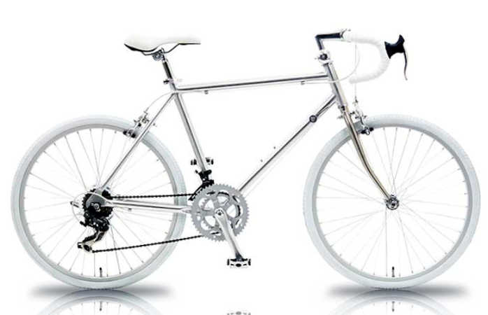 特徴的なポリッシュ仕上げのシルバーフレームと調和しあうホワイトカラー。シンプルながらもしっかりと個性を持ったデザインと、初心者の方でも安心の補助ブレーキ装備は気軽にロードを楽しみたい方にピッタリです。