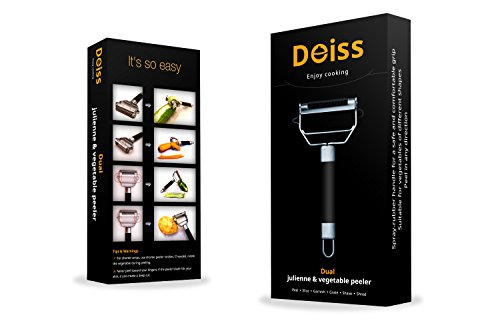- Feature : Care for Your Loved Ones ★ Cook healthy, raw veggie dishes for your family with ease! Peeling vegetables has never been so simple. / Enjoy Your Food ★ Decorate your dishes with delicious-looking garnishes. Work miracles in the kitchen with a single motion. Wow your friends with your restaurant-quality presentation! / Save Room in the Kitchen ★ Replace a variety of culinary utensils with a single Deiss julienne peeler. Forget about food-processor problems - the Deiss peeler is always ready for use and easy to clean. / Feel Like an Artist ★ This stylish peeler is like an artist's brush in your hands. Free your creativity to invent new dishes. Make your everyday cooking entertaining! / Lifetime Warranty ★ Deiss kitchenware and Karl Deiss personally provide a lifetime warranty on all our products. The stainless steel peeler will serve you for years and is dishwasher-safe!