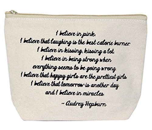 -. Binding : Misc. -. Brand : Jules -. EAN : 0638183959978 -. Feature : Cotton lined with inner pocket and zipper closure / High Quality Bag Measures 9" x 6.5" x 2" / Perfect for make-up, accessories, pencils and any other collections! / Great for gifts for bride to be gift, graduates, bridesmaid gifts, baby shower gifts, and other milestone moments -. IsAdultProduct : 0 -. Label : Jules -. Manufacturer : Jules -. MPN : J-BELIEVE -. PartNumber : J-BELIEVE -. ProductGroup : Beauty -. ProductTypeName : BEAUTY -. Publisher : Jules -. Studio : Jules -. Title : "I Believe In Pink" Audrey Hepburn Quote Natural Canvas Zipper Bag for Cosmetics and Collections -. UPC : 638183959978
