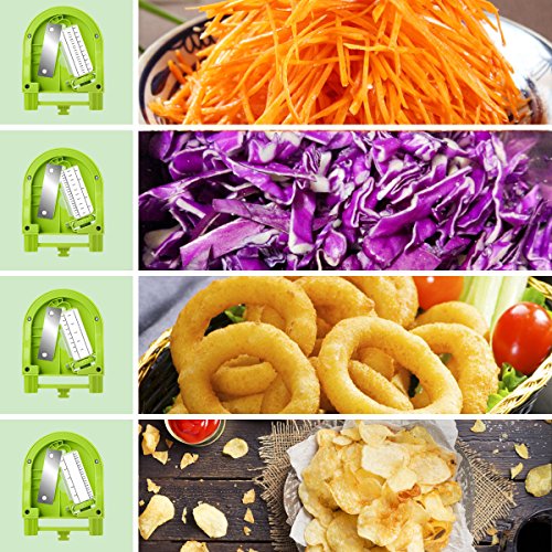 - 【INTELLIGENTLY DESIGNED】The vegetable Spiralizer's 4 switch blades Provides a fun and unique way to create spaghetti cut (0.12 inch), fettuccine cut (0.24 inch), linguine cut (0.35 inch), or ribbon cut (0.1 ~ 2.3 inch), depend on the veggies' thickness.Everyone can ake ordinary vegetables and fruits into amazing spirals, ribbons, zoodles, and chips just as professional chef. So colorful shapes and tasty,no only yourself, but also get your kids to eat more veggies and fruits.