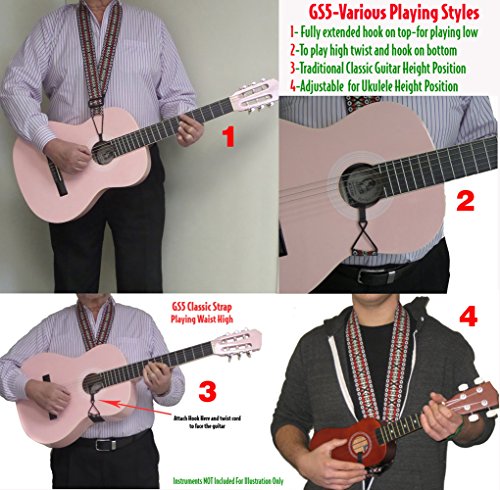 -. Brand : Performance Plus -. Feature : Classical Guitar/Ukulele Strap Black or Woven Tapestry Hootenanny Pattern with No Mar Nylon "J Shaped" Hook / 2" Classical Guitar/Ukulele Strap with Adjustable Length / Perfect for Mariachi Bands and strolling musicians playing Classic guitars / Works well with any classical guitar, vihuela, and all size ukuleles / Does not require strap buttons or pegs. Easy to install and remove. -. Label : Dealer Direct -. Manufacturer : Dealer Direct -. Model : GS4-5 Strap -. MPN : GS4-5 Strap -. PackageQuantity : 1 -. PartNumber : GS4-5 Strap -. ProductGroup : Musical Instruments -. ProductTypeName : INSTRUMENT_PARTS_AND_ACCESSORIES -. Publisher : Dealer Direct -. Studio : Dealer Direct -. Title : Performance Plus Classical Guitar/Ukulele Strap- Adjustable Length with No Mar "J Style Hook"