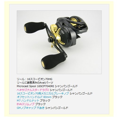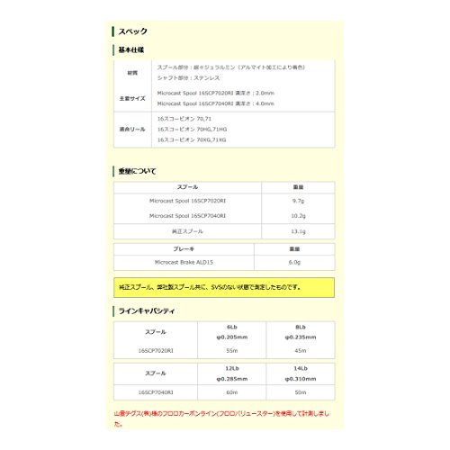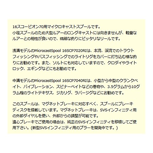 -. Feature : カラー:シャンパンゴールド / 材質:スプール部分 超々ジュラルミン(アルマイト加工により着色) / 材質:シャフト部分 ステンレス / 重量:10.3g / 適合リール:16スコーピオン 70,71/16スコーピオン 70HG,71HG/16スコーピオン 70XG,71XG / ラインキャパシティ:12lb 60m / ラインキャパシティ:14lb 50m