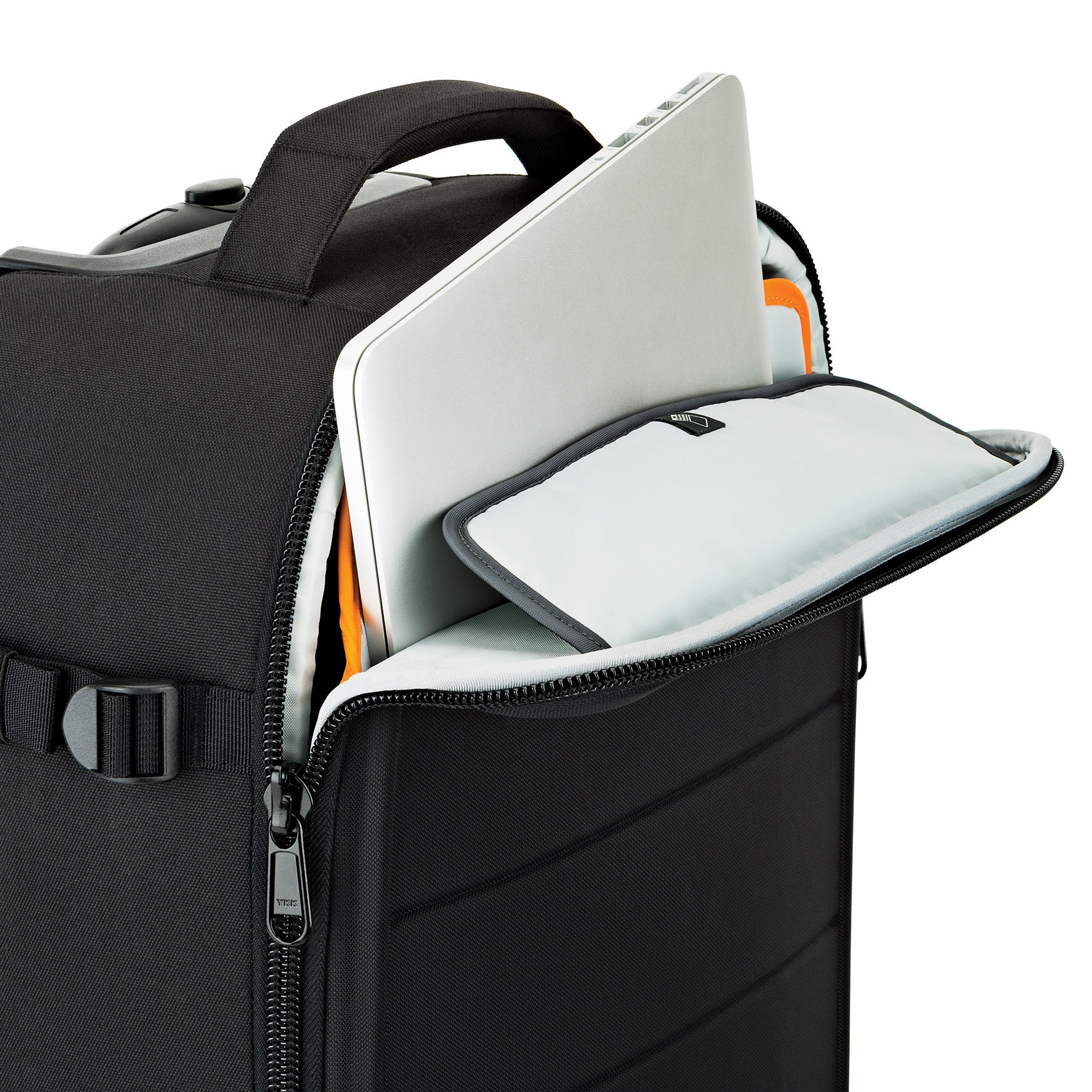 Since the front panel can open only the top, you do not need to fully open the bag to take out the laptop.
