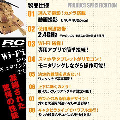 ●専用アプリで操作可能!コントロールから撮影まで簡単操作! ●低アングルから撮影!カメラ搭載!動画も静止画も思いのまま! ●スマホやタブレットからモニタリングしながらの撮影が可能! ●前進後退、左右旋回、さらにカメラが上下に動く!コントロール自在! ●混信の無い安定した電波帯域で快適な走行! ●キャタピラタイプなので多少のデコボコ道でも走行可能!楽しみ方が広がる!