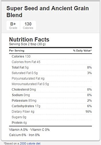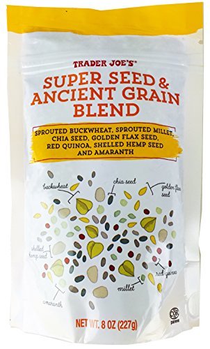 -. Feature : Trader Joe's Super Seed & Ancient Grain Blend is truly a super blend of seeds like chia, flax, h.e.m.p, red quinoa, amaranth and sprouted grains like buckwheat and millet. / Sprouting (germinating) the grains increases the bioavailability of their nutrients; thus, you get more of all the good things the grains have to offer when they're sprouted. / Each two tablespoon serving gives you 2,000mg of Omega-3 fatty acids and four grams of fiber, as well as four grams of protein. / This genius mix of super seeds and ancient grain will be your new favorite condiment. It makes tasty cereal toppers and oatmeal companions. SP.R.Inkle it on anything - yogurt, roasted veggies, for a crunchy, nutrient- packed flavor boost. / They come in handy, resealable 8oz (227g) bag that's easy to store in your pantry.