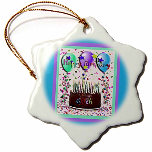 3dRose orn_20206_1 Happy Birthday 60th Chocolate Cake Porcelain Snowflake Ornament, 3-Inch