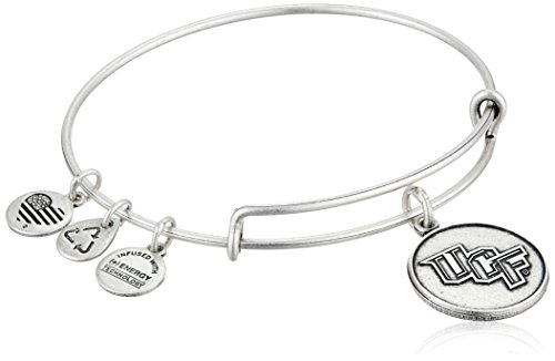 Expandable wire bangle bracelet featuring University of Central Florida logo charm and three signature Alex and Ani charms
