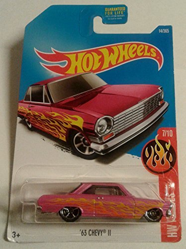 -. Binding : Toy -. Brand : Hot Wheels -. EAN : 0074299286346 -. Feature : 1:64 scaled die-cast car. / Pink with orange and yellow stripes. / 7/10 in the 2017 HW Flames series. / 14/365 in the 2017 Hot Wheels line. -. IsAdultProduct : 0 -. Label : Mattel -. LegalDisclaimer : Warning - This car is not suitable for children under 36 months. Small parts may be generated. -. Manufacturer : Mattel -. PackageQuantity : 2 -. ProductGroup : Toy -. ProductTypeName : TOYS_AND_GAMES -. Publisher : Mattel -. Studio : Mattel -. Title : Hot Wheels 2017 HW Flames '63 Chevy II 14/365, Pink -. UPC : 074299286346