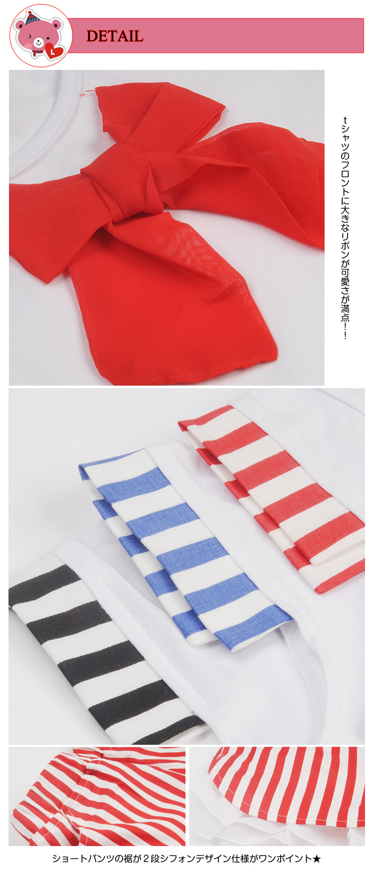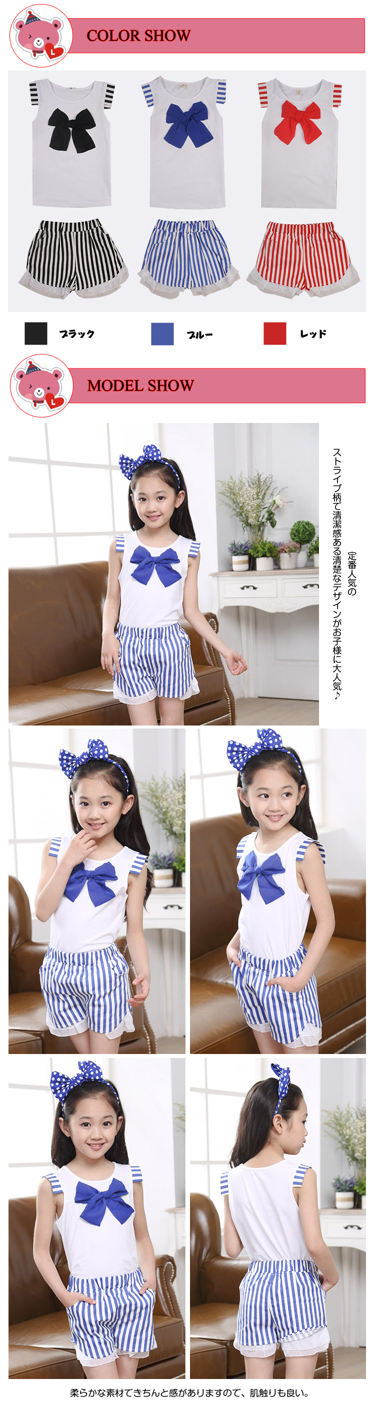 | 定番人気のストライプ柄で清潔感ある清楚なデザインがお子様に大人気?リボンが可愛くて、お姫様のあこがれの要素をすべて実現させます。柔らかな素材できちんと感がありますので、肌触りも良い。トップス+レギンス付きスカート★セットアップが絶妙なコーデで、かわいい、お好きなお方は早めにどうぞ?ショートパンツ+リボンtシャツ★2点セットで超お買い得!コーディネートに悩む必要もなし! | |