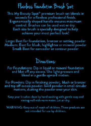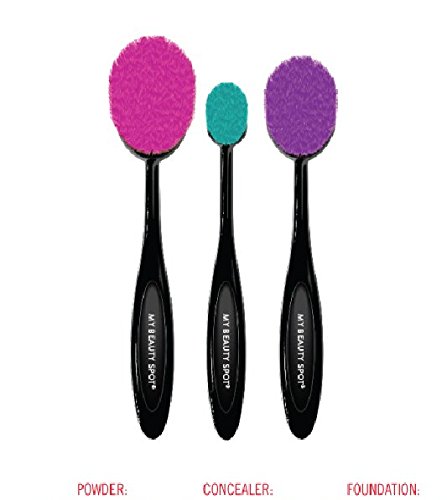 Includes - 1 Hot Pink Bristled Large Oval Brush - Best For Foundation, Bronzer, Or Setting Powder. - 1 Purple Bristled Medium Oval Brush - Best For Blush, Highlighter, Or Mineral Powder. - 1 Turquoise Bristled Small Oval Brush - Best For Concealer, Eye Shadow, Or Contour Powder.