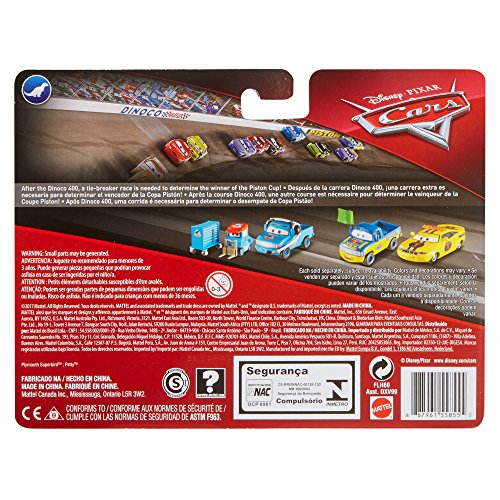 -. Binding : Toy -. Brand : Disney -. EAN : 0887961558555 -. Feature : Storytelling 2-Pack of favorite characters from Disney/Pixar cars 3 / Inspired by key movie moments between two dynamic characters / With iconic paint, logos and special new designs, to authentically recreate the action and laughs! / Each 2-Pack sold separately, subject to availability / Collect them all! -. IsAdultProduct : 0 -. Label : Mattel -. Manufacturer : Mattel -. Model : FLH60 -. MPN : FLH60 -. NumberOfItems : 1 -. PackageQuantity : 1 -. PartNumber : FLH60 -. ProductGroup : Toy -. ProductTypeName : TOYS_AND_GAMES -. Publisher : Mattel -. ReleaseDate : 2017-11-01 -. Studio : Mattel -. Title : Disney Cars Character Car the King & Chick Hicks Toy Vehicle (2 Pack) -. UPC : 887961558555 -. Warranty : 1 year warranty against manufacturer defects