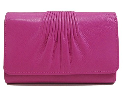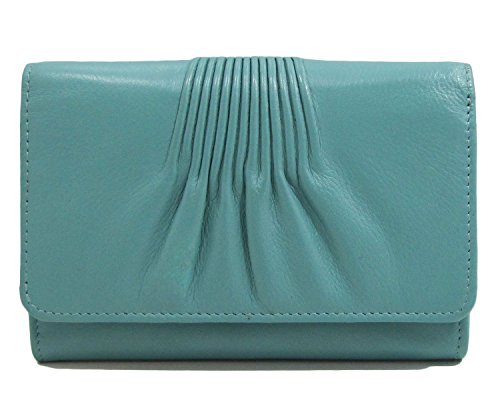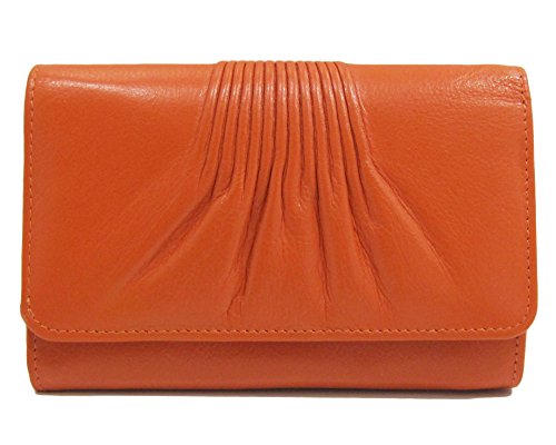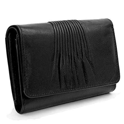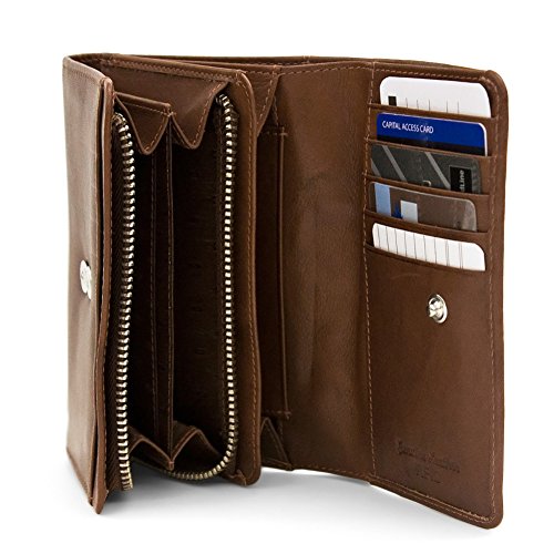 Product Description Made from soft genuine leather with RFID Blocking (Radio Frequency ID). Back slip pocket. Snap compartment with slip and zip pockets. 9 credit card slots. 0
