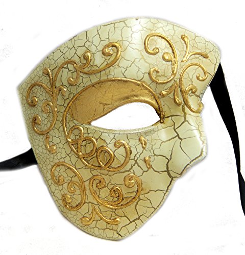 -. Brand : Bauer Pacific -. ClothingSize : One Size -. Color : Beige, Gold -. Department : mens -. Feature : Beige crackle base with gold painted details / Secures with 2 black ribbon ties / Made out of sturdy plastic -. Model : 13683-GLD -. ProductGroup : Apparel -. ProductTypeName : ADULT_COSTUME -. Size : One Size -. Title : Bauer Pacific Beige/Gold Half Face Calverus Masquerade Mask -. UPC : 690155136831