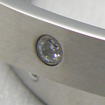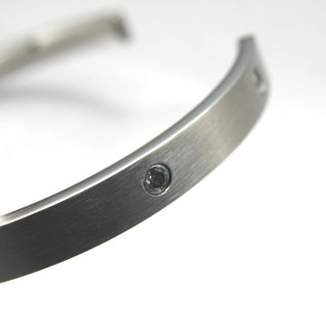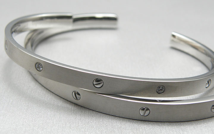 表面はステンレスならではのマットタイプのバングルです。等間隔にビスデザインが施されている、カジュアルな仕上がりとなっています。レディースサイズのほうには、ビスと交互にジルコニアが施されていて、女性らしさも忘れていません☆