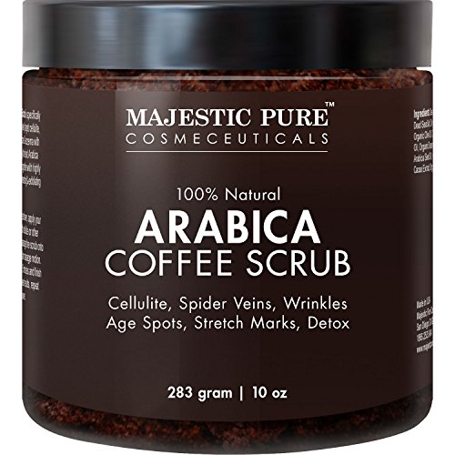 - Majestic Pure Arabica Coffee Scrub is natural and specifically formulated for cellulite, stretch marks, spider veins, acne, age spots & eczema with caffeine from only the best Arabica beans; blended together with highly moisturizing, regenerating & exfoliating oils & salts; for men and woman; manufactured in USA in GMP lab