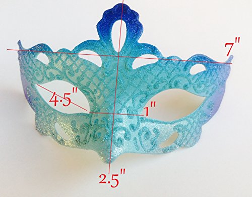 -. Feature : One size fits most, 6 yrs and up. / Measures 7.5" Length x 3" Height. / Matching ribbons attached. / Mask base colors: turquoise, Blue, purple and Glitter.