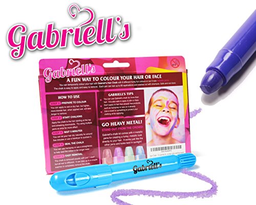 - 12 Colorful hair chalk markers: Gabriell’s assorted variety of colorful hair chalks are ready for your choice. Do it yourself according to your mood and how you are planning to dress-up tonight with so many different colors. They are also perfect for doing designs on your pet's hair. 8 solid colors and 4 glitter color.