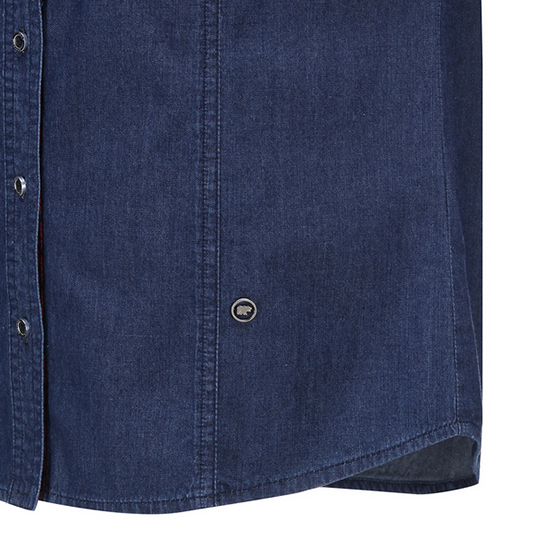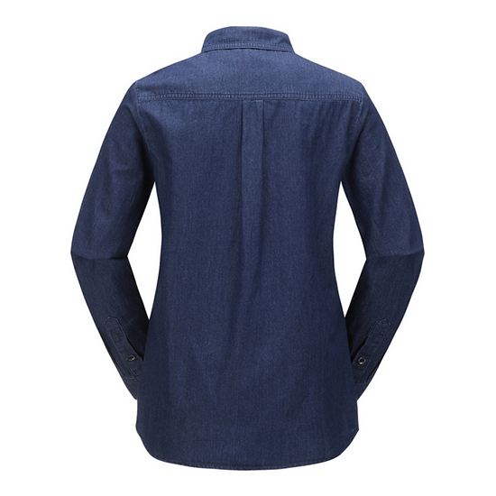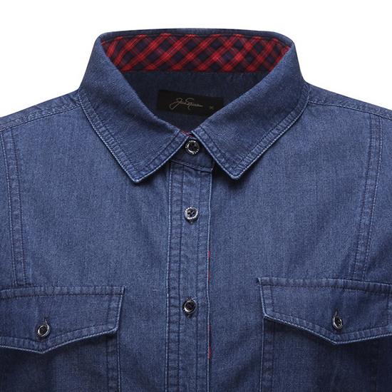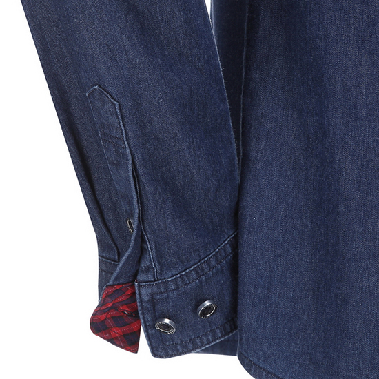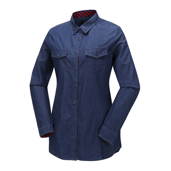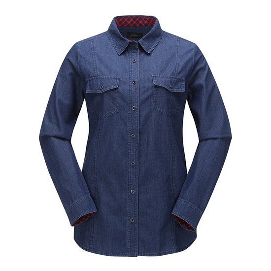 - 체크 배색 포인트 디자인의 여성 데님 셔츠.