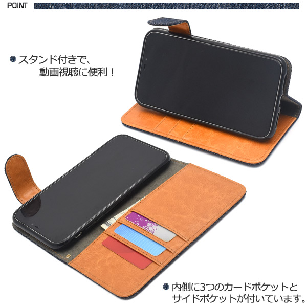 デニムデザインの手帳型ケース。 衝撃やキズなどからスマホを守ります。 内部ケースはソフトケースなので、着脱が簡単です。 男女どちらでもお使いいただける、スタイリッシュなデニムデザイン。 内側は落ち着いたレザーデザインです。 背面を折り返すとスタンドとして使用できるので、動画視聴に便利です。 落下防止に便利なストラップホール付きです。 横開きタイプなので、手帳のように使うことができます。 また、内側に3つのカードポケットとサイドポケット付きです。 ※スマートフォンは付属しません。※ライセンス商品ではありません。 |