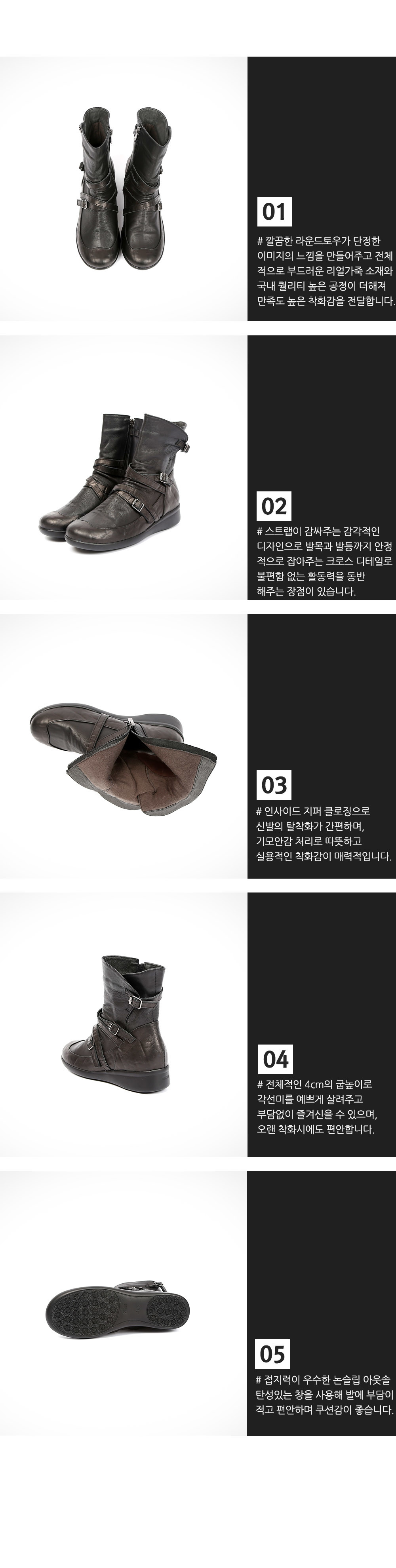 스트아 스트랩 앵클부츠 활용도 만점의 데일리아이템 소개합니다. 발목에 더해진 크로스 스트랩 라인이 시크한 디테일을 연출 군더더기 없는 깔끔하게 떨어지는 라인으로 유행보단 실용성을 중요시 제작 바닥을 제외한 기모안감 처리로 따뜻하고 짱짱한 착용감을 선사합니다. 굽높이 약 4cm로 디자인적인 다리라인을 편안하고 이쁘게 만들어드립니다. 인사이즈 지퍼 디테일로 착용하고 벗기가 자유로우며 접지력이 우수한 논스립 아웃솔 탄성있는 창을 사용하여 발에 부담이 적고 편안하며 쿠션감이 좋습니다. .
