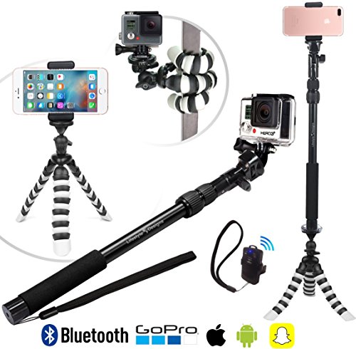 ULTIMATE PHOTO GIFT PACK for New GoPro Hero5 AND iPhone 7 – The #1 preferred tripod accessory used by pro photographers & video makers on YouTube meets the #1 HD Selfie Stick. The Perfect Combo for anyone with a new GoPro, Smartphone or Camera. Mount your phone anywhere and use the included Bluetooth shutter remote to snap photos & videos from up to 30 feet away. It even works with Snapchat.