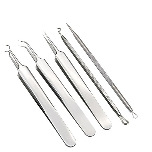 DOUBLE-ENDED TOOLS: 2 pieces dual-ended comedones removal tool and 3 tweezers, the pimple extractor is durable and each piece is scientifically designed for optimal performance.