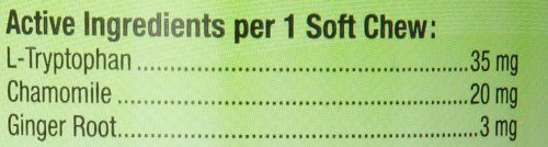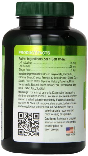 - Feature : Smoke bacon flavored soft chews / Help soothe and calm dogs naturally / Veterinary formulated with tryptophan; chamomile and ginger / May also curb destructive behavior and motion sickness / Great for anxiety in smaller dogs