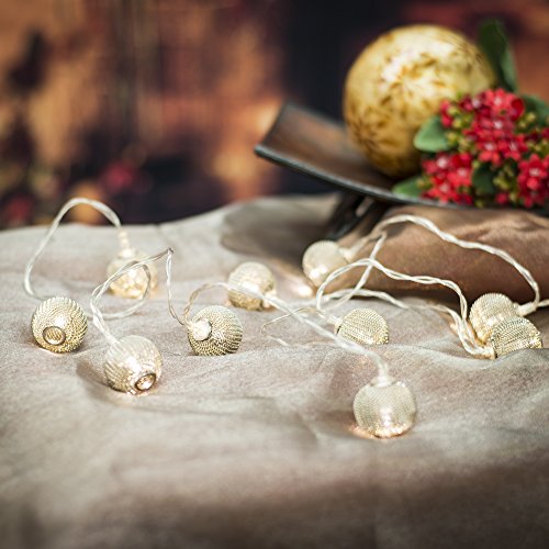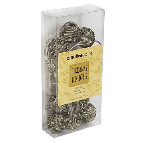Studio : Creative Co-op Publisher : Creative Co-op Product Description This fun, festive light decoration from Creative Co-op measures 5.25 feet long and is operated by 2 AA batteries (not included). The ball shape lights give off a silvery glow and works as a great room accent piece to put in a wreath, on a table or hang from a wall. Comes in acetate packaging. LED lights. 0