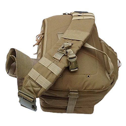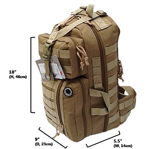 -. Feature : Perfect for outdoor use! / Wide and Thick sling shoulder strap, Tan / Capacity: 1200 cu. in. / Size: 18"(Height) x 9"(Width) x 5.5"(Depth) / Multiple MOLLE style straps and Audio pass-through hole in front pocket