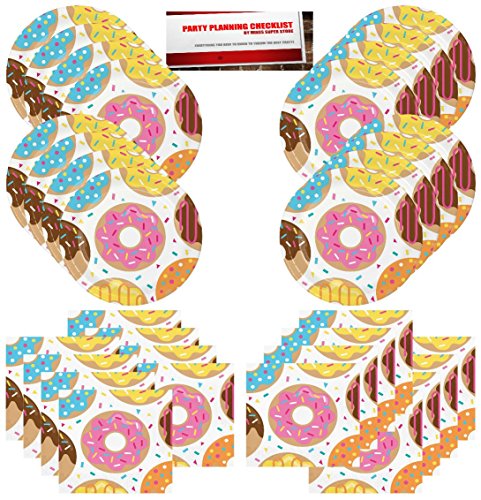 Donut Party Supplies Bundle Pack for 16 guests (Plus Party Planning Checklist by Mikes Super Store)