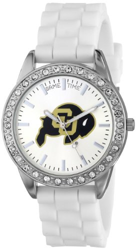 -. Binding : Watch -. Brand : Game Time -. Color : Colorado State University -. Department : womens -. EAN : 0846043099553 -. Feature : Solid white, soft, pliable and durable silicone strap with a solid stainless steel buckle closure / Solid silver-tone, alloy metal case with solid stainless steel case back and crown / Durable mineral crystal protects watch from scratches; all with a limited lifetime warranty / Water-resistant to 30 M (99 feet) -. IsAutographed : 0 -. IsMemorabilia : 0 -. Label : Game Time -. Manufacturer : Game Time -. Model : COL-FRO-COL -. MPN : COL-FRO-COL -. NumberOfItems : 1 -. PackageQuantity : 1 -. PartNumber : COL-FRO-COL -. ProductGroup : Watch -. ProductTypeName : WATCH -. Publisher : Game Time -. ReleaseDate : 2014-01-24 -. Size : NO SIZE -. Studio : Game Time -. Title : Game Time Women's COL-FRO-COL "Frost" Watch - Colorado -. UPC : 846043099553
