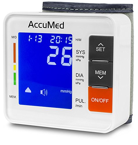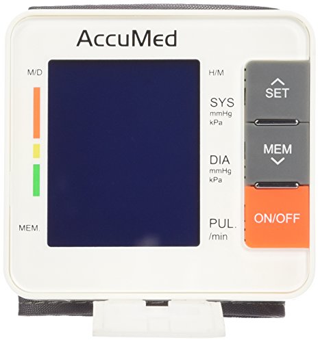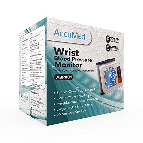 -. Title : AccuMed ABP801 Portable Wrist Blood Pressure Monitor with One-Touch Intelligent Automatic Measurement (White) - 4-in-1 Functionality for Systolic / Diastolic BP, Heart Rate (BPM), Hypertension Guide (WHO Classification Indicator), & Arrhythmia Alerts - Includes Voiced Audio / Silent Mode, High-Contrast LCD Display, Built-in Storage Memory, Clamshell Carrying Case, USA Warranty, and More *FDA Approved with Clinically Proven, Professional Accuracy for Home Medical Use