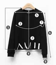 | 尺码 | ①前衣长 | ②后中长 | ③胸围 | ④下摆围 | ⑤肩宽 | ⑥袖长 | ⑦袖臂围 | ⑧袖口围 | ||