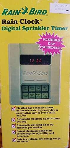 -. Brand : Rain Bird -. Color : Green -. EAN : 0077985076009 -. Feature : Automatic watering up to 3 times per day and up to 99 minutes per station / Safe low voltage, low energy usage, and UL listed / Electronic solid-state technology for reliability and accuracy / Easy to install, plugs into any standard outlet / Easy to adapt, works with any automatic sP.R.Inkler valve -. Label : Rain Bird SP.R.Inkler Manufacturing corp. -. Manufacturer : Rain Bird SP.R.Inkler Manufacturing corp. -. Model : PC-106-PS -. PackageQuantity : 1 -. ProductGroup : Lawn & Patio -. ProductTypeName : OUTDOOR_LIVING -. Publisher : Rain Bird SP.R.Inkler Manufacturing corp. -. Studio : Rain Bird SP.R.Inkler Manufacturing corp. -. Title : Rain Bird Rain Clock Digital SP.R.Inkler Timer -. UPC : 077985076009