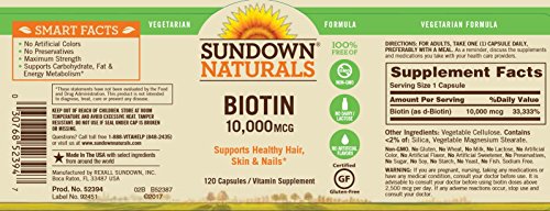 Sundown Naturals Vegetarian Biotin supplies you with 10,000 mcg of this important B Vitamin, in an easy, one-capsule dose. As part of the B family of vitamins, Biotin supports energy metabolism, and is essential for the intermediate metabolism of carbohydrates, proteins and fats.* Sundown Naturals Vegetarian Biotin is a maximum strength formula that also provides support for hair, skin and nail health.*Feature