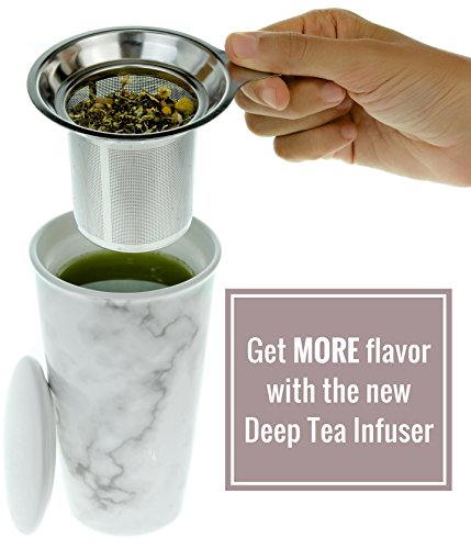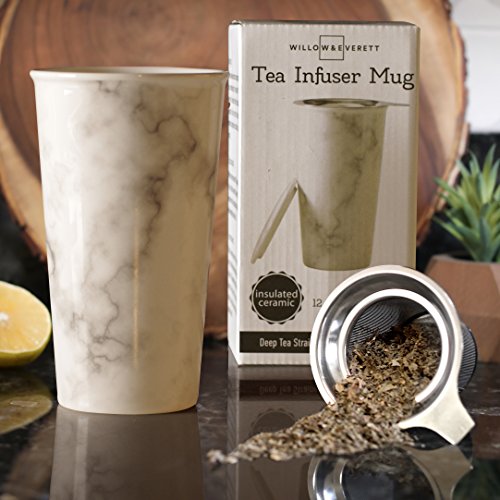 Studio : Willow Everett Publisher : Willow Everett Product Description Your 12oz ceramic travel tea mug holds more tea than smaller mugs and comes with a bonus silicone lid to help you transport your tea while you're on-the-go. The removable stainless steel infuser basket makes steeping loose tea easy. Simply add your favorite loose tea to the infuser, and pour boiling water over the basket then cover with the included ceramic lid to steep. When you reach your desired tea strength you are on your way to enjoying a generous 12oz cup of tea! 0