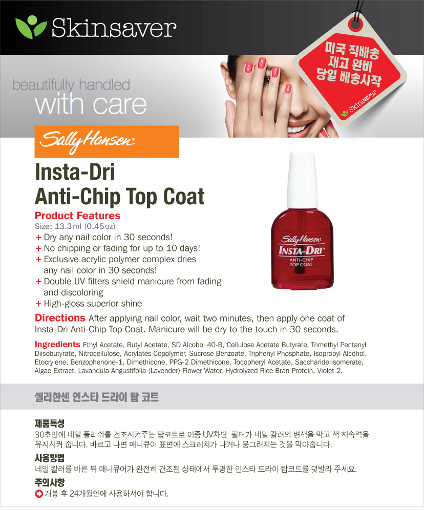 제조국 : 미국, 주요성분: 에틸 아세테이트, 부틸 아세테이트, 니트로 셀룰로오스, 트리 페닐 인산염, 아 디프 산 / 네오 펜틸 글리콜 / 트리 멜리 트산 무수물 공중 합체, 이소 프로필 알코올, 스티렌 / 아크릴 레이트 코 폴리머, 트라이 Pentanyl Diisobutyrate, 스테아르 벤토나이트, 벤조 페논-1, 스테아르 헥토 라이트, 메틸 메타 크릴 레이트 가교 중합체, 자당 초산 이소 , 에틸 Tosylamide, 디메 치콘, 수산화 알루미늄, 구연산, 칼슘 나트륨 붕 규산염, 칼슘 알루미늄 보로 실리케이트, 합성 플루오르 플 로고 파이트 (fluorphlogopite), 실리카, 주석 산화물. 이 포함될 수 있습니다 운모, 이산화 티타늄 (CI 77891), 알루미늄 분말 (CI 77000), FD & C 황색 제 5 호 알루미늄 레이크 (CI 19140), FD & C 청색 1 호 알루미늄 레이크 (CI 42090), D & C 레드 6 번 바륨 호수 (CI 15850), 페릭 암모늄 페로시 아나이드 (CI 77510), D & C 레드 7 호 칼슘 레이크 (CI 15850), D & C 레드 34 호 칼슘 레이크 (CI 15880), 산화물 철 (CI 77491, CI 77492, CI 77499), 비스무스 옥시 클로라이드 (CI 77163), D & C 옐로우 11 호 (CI 47000), D & C 블랙 2 호 (CI 77266)